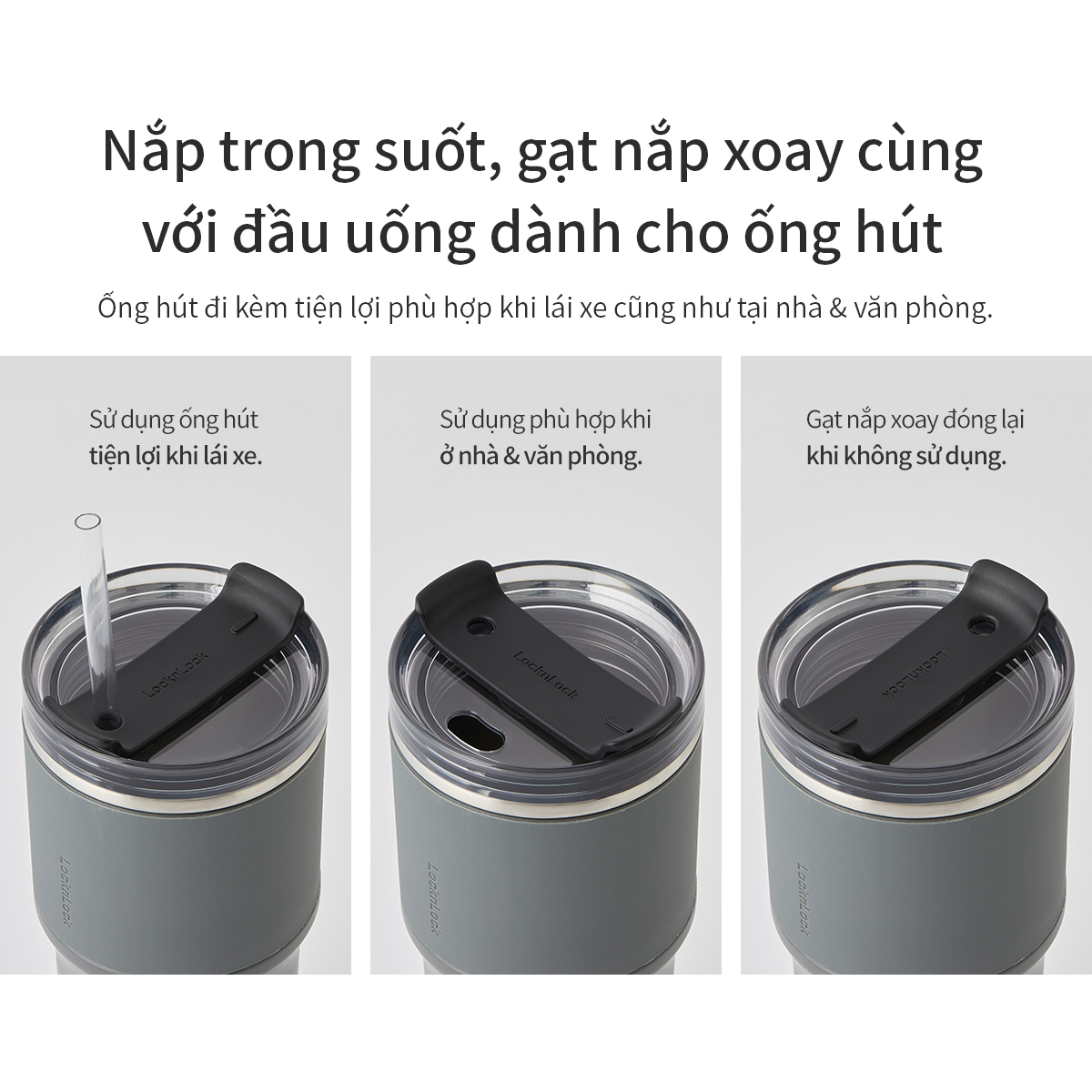 Nắp xoay có lỗ ống hút giúp cố định ống hút ngay ngắn; khi không sử dụng, bạn chỉ cần nhẹ nhàng xoay nắp lại để đóng, ngăn ngừa bụi bẩn xâm nhập.