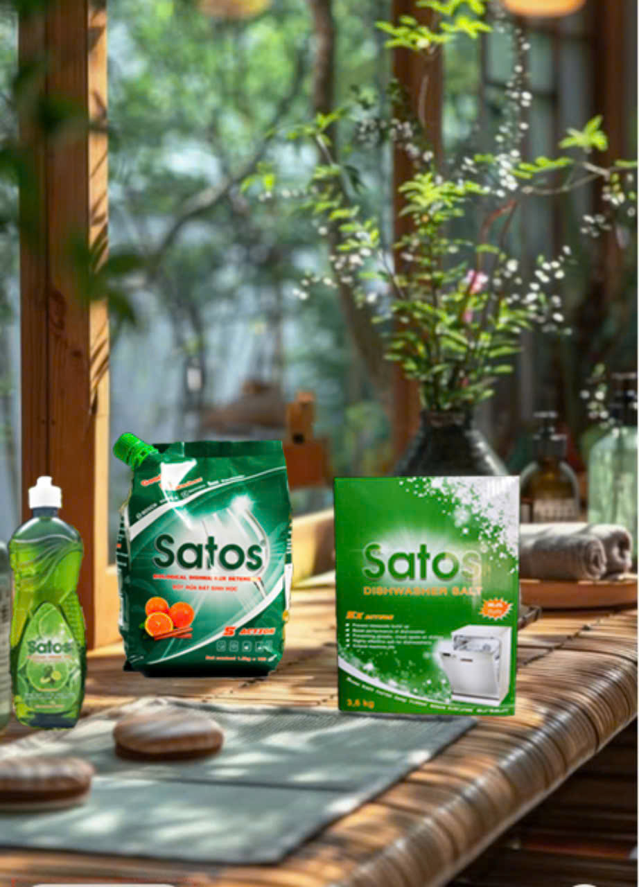 - Trong thành phần bột rửa sinh học Satos có muối làm mềm nước và chất làm bóng nhưng em vẫn khuyên anh chị nên dùng kèm muối bóng Satos để đạt hiệu quả rửa cao nhất.