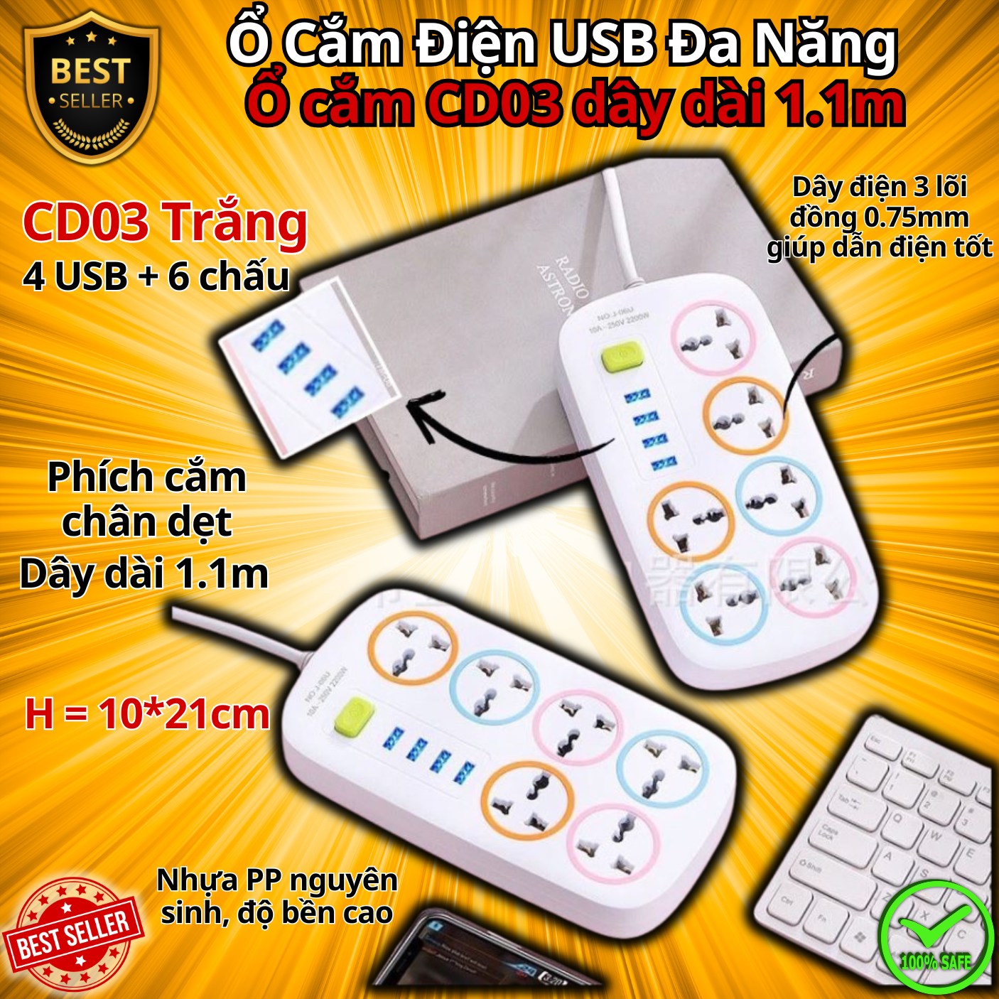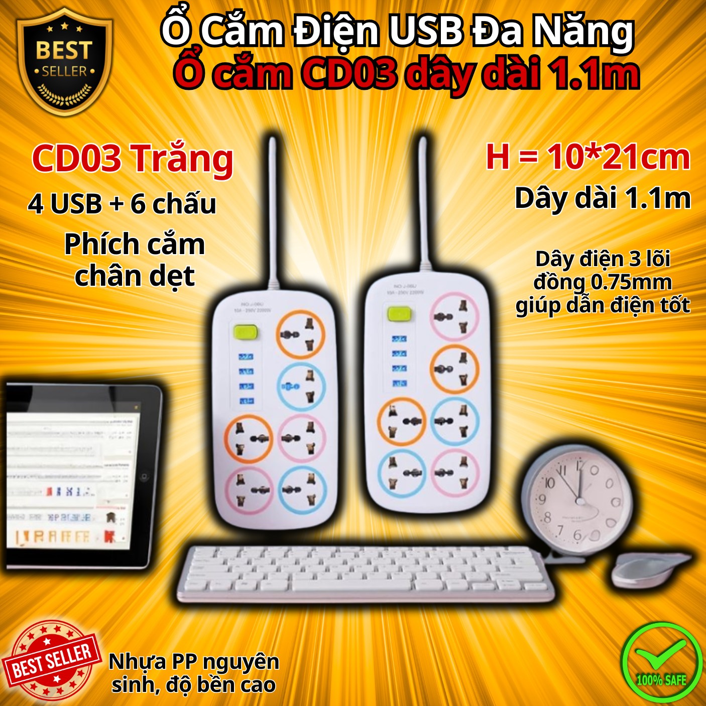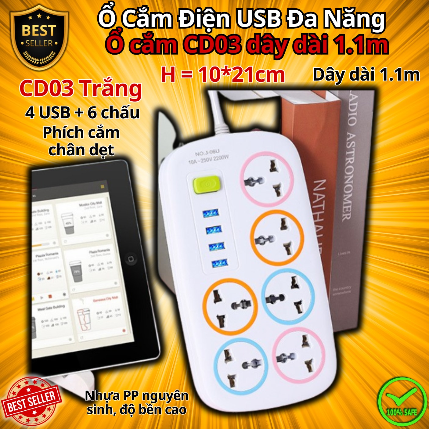 Mã ổ cắm CD03 Trắng 6 chấu – dây 1.1m