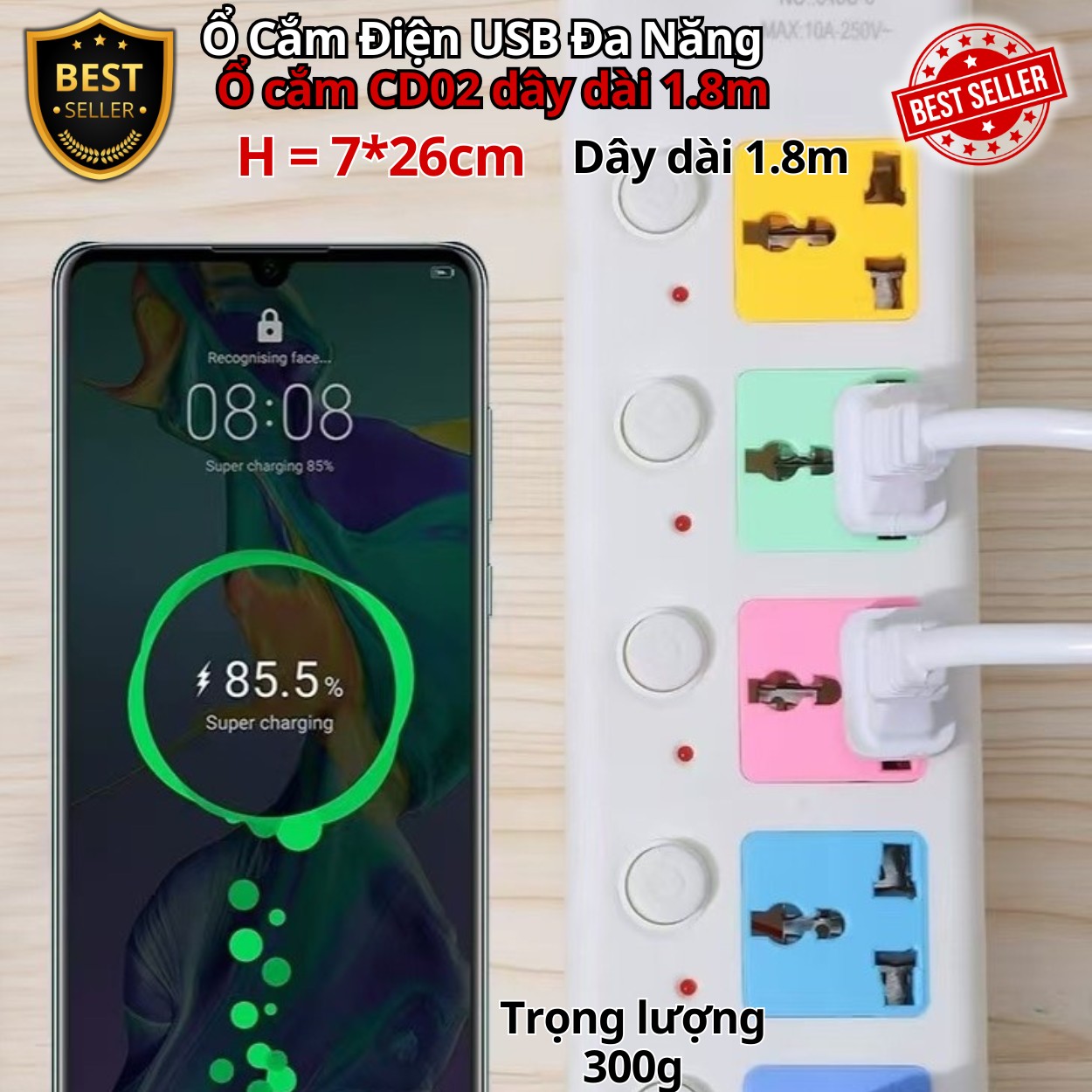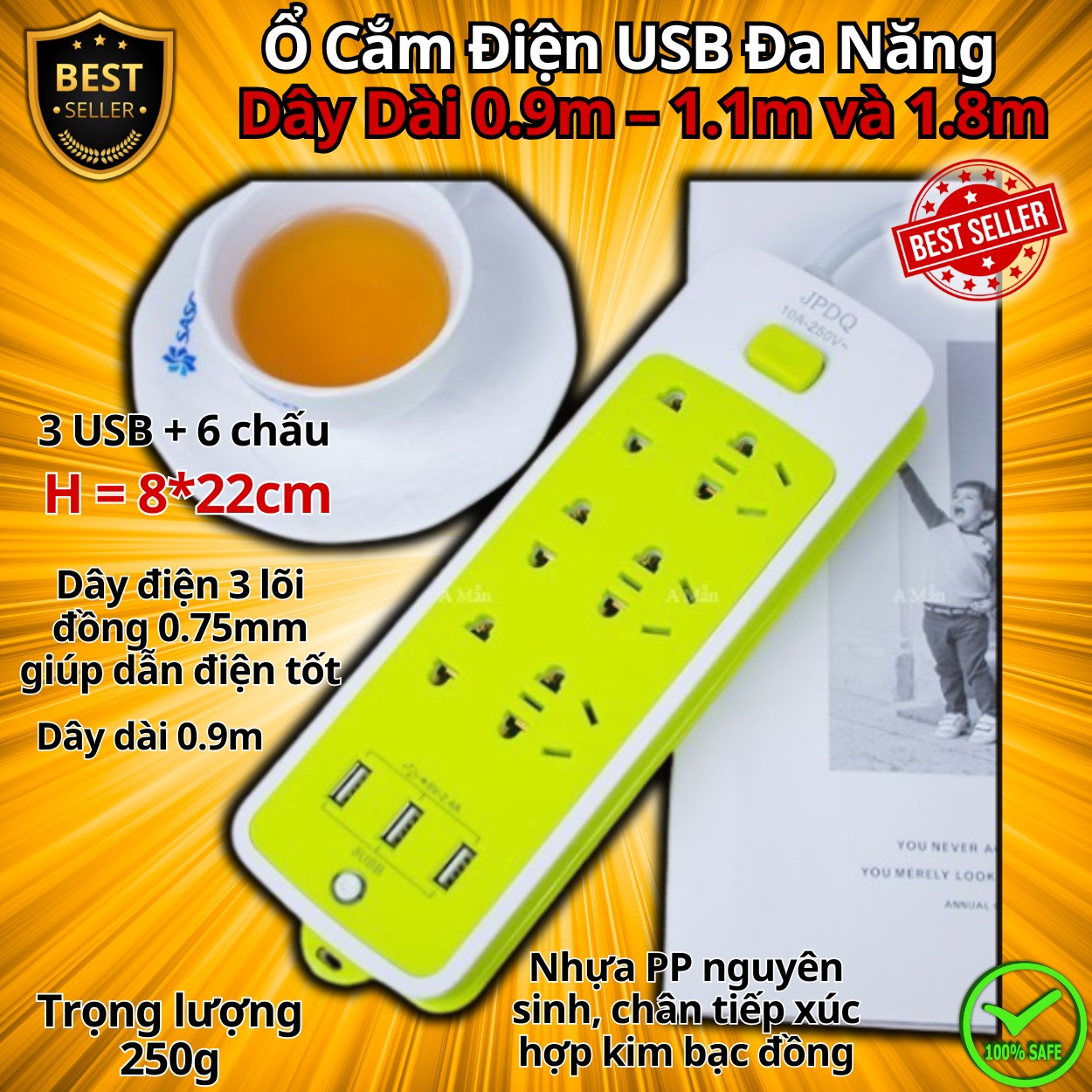 Ổ cắm điện đa năng được Tích hợp 6 dắc cắm điện và 3 cổng usb để sạc điện thoại