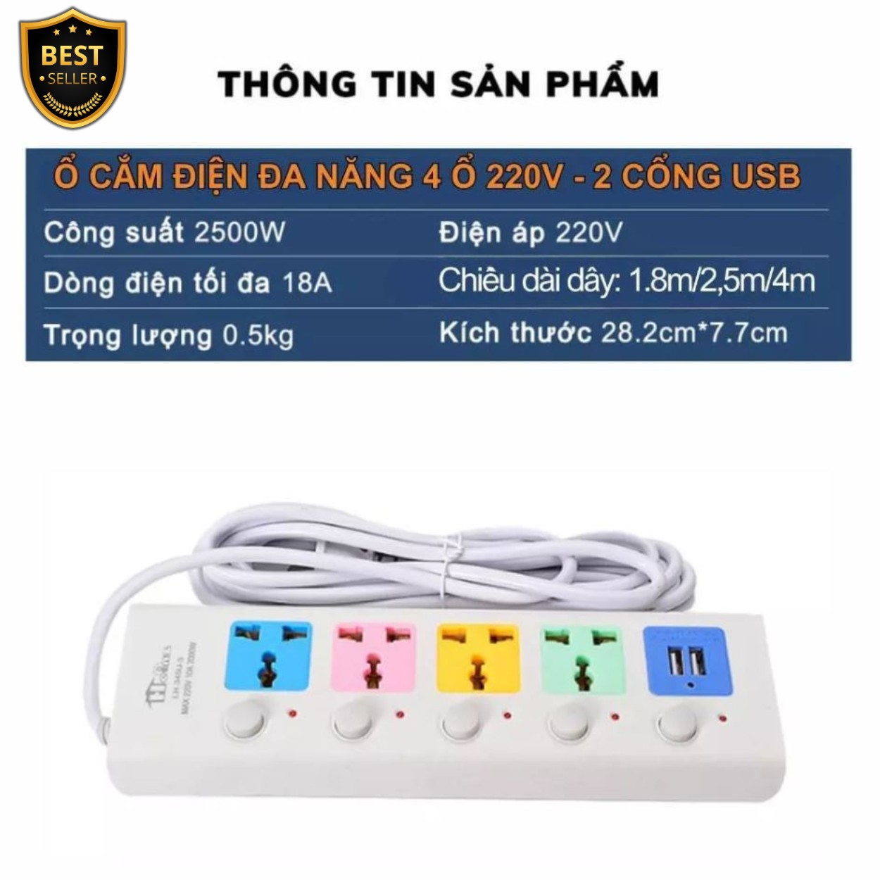 Nhập mã TECKITKBD FREESHIP 20k cho đơn 0đ tại Tiki.Vn Giới thiệu Ổ Cắm Điện Công Suất 2500W Có Chốt An Toàn Tiện Lợi, Chính Hãng, Ổ Cắm Điện USB Đa Năng Cao Cấp Chống Giật Dây Dài 0.9m – 1.1m và 1.8m