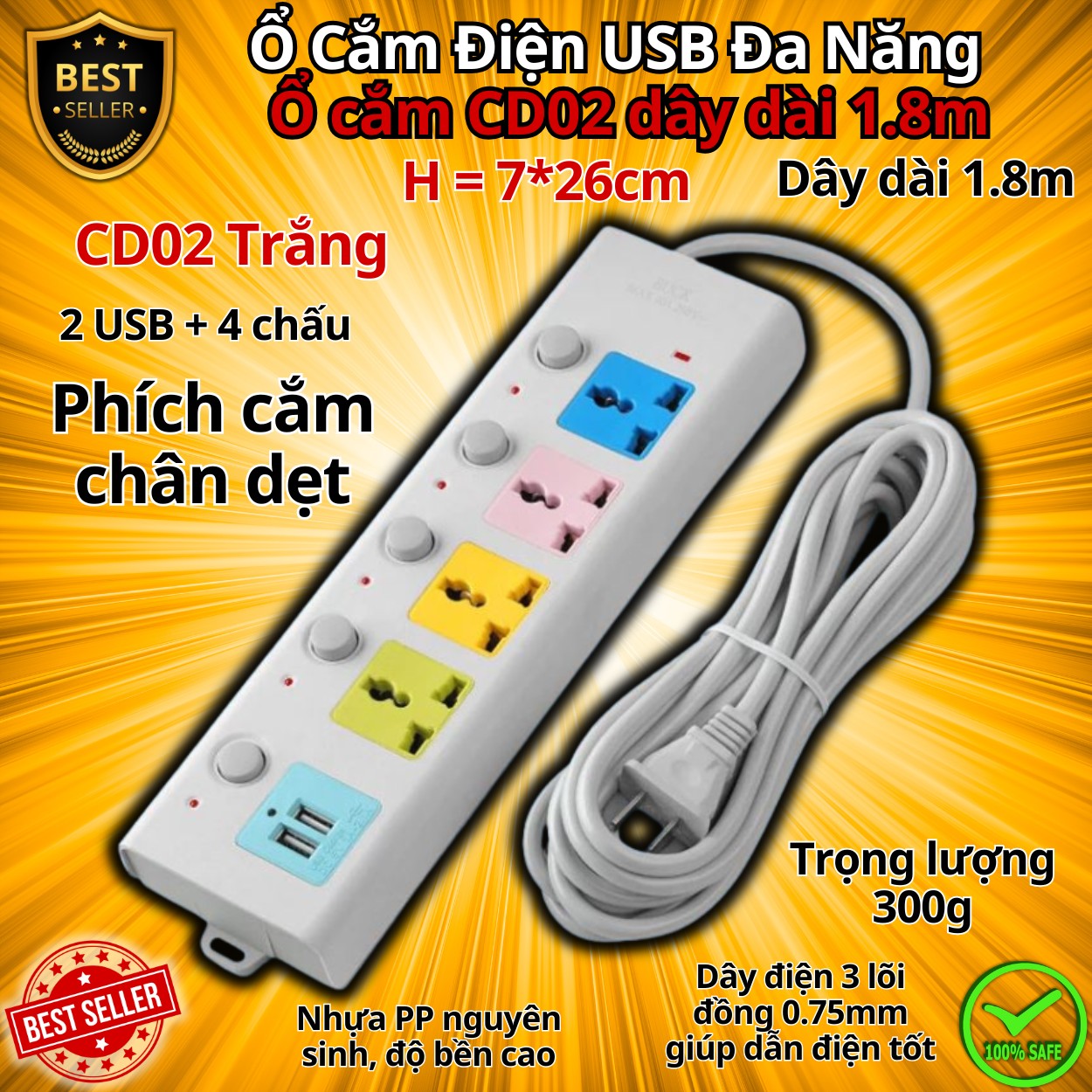 - Phích cắm chân dẹt, 2 USB + 4 chấu