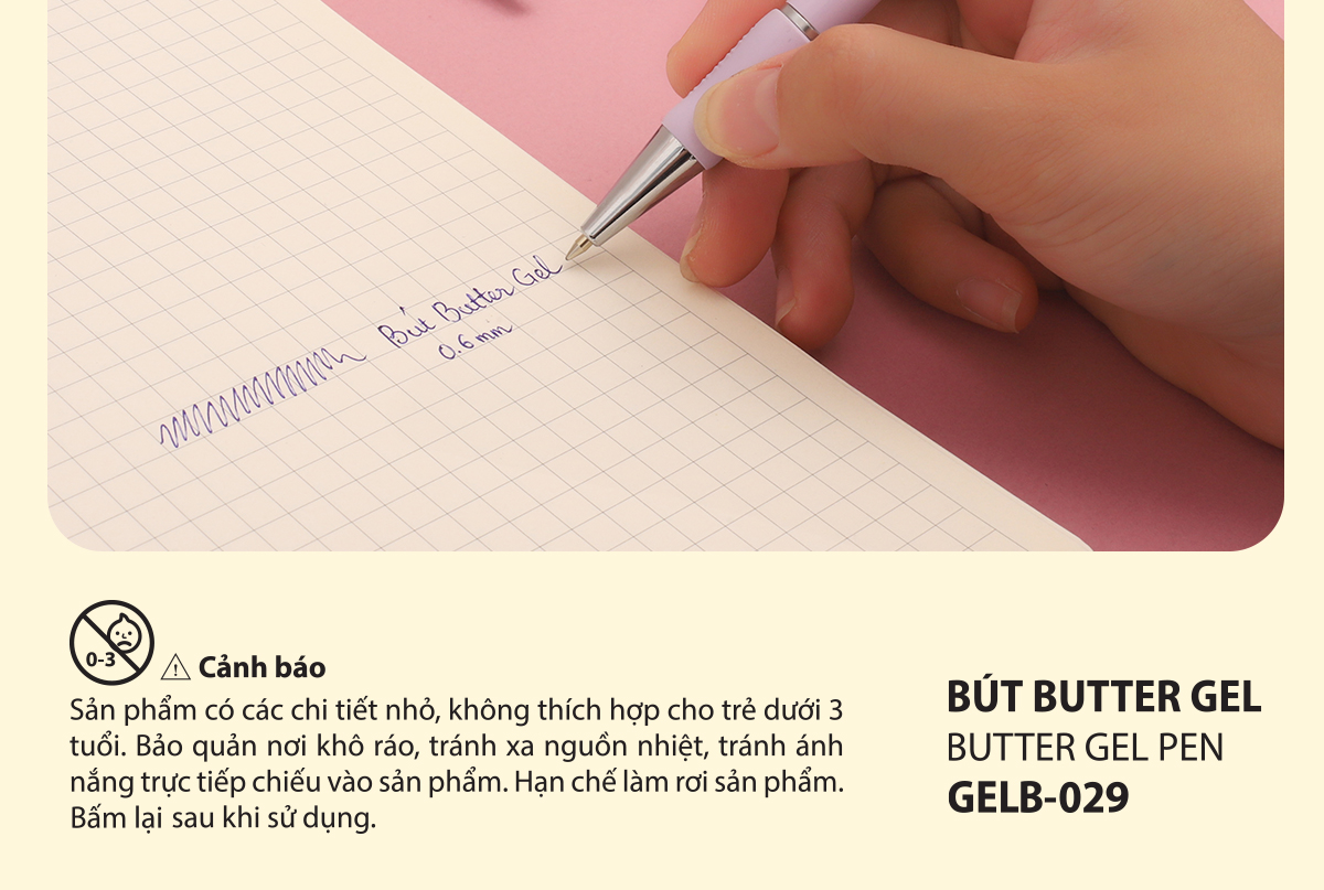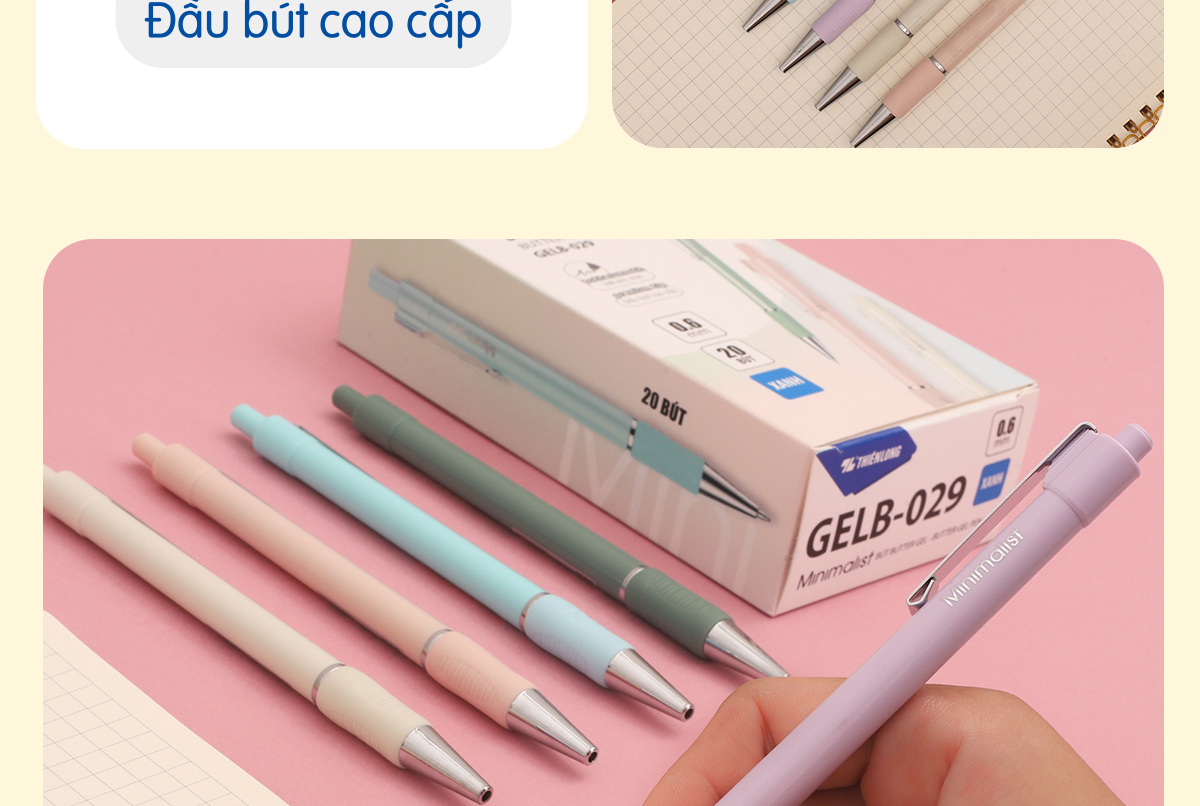 Thông số kĩ thuật :Thương hiệuThiên LongĐường kính viên bi0.6 mmTiêu chuẩnTCCS 009:2011/TL-BGELKích thước141mm (GelB-028); 149mm (GelB-029)Xuất xứViệt NamSản xuấtViệt NamKhuyến cáoTránh nguồn nhiệt, hóa chất. Không thích hợp cho trẻ dưới 3 tuổi.