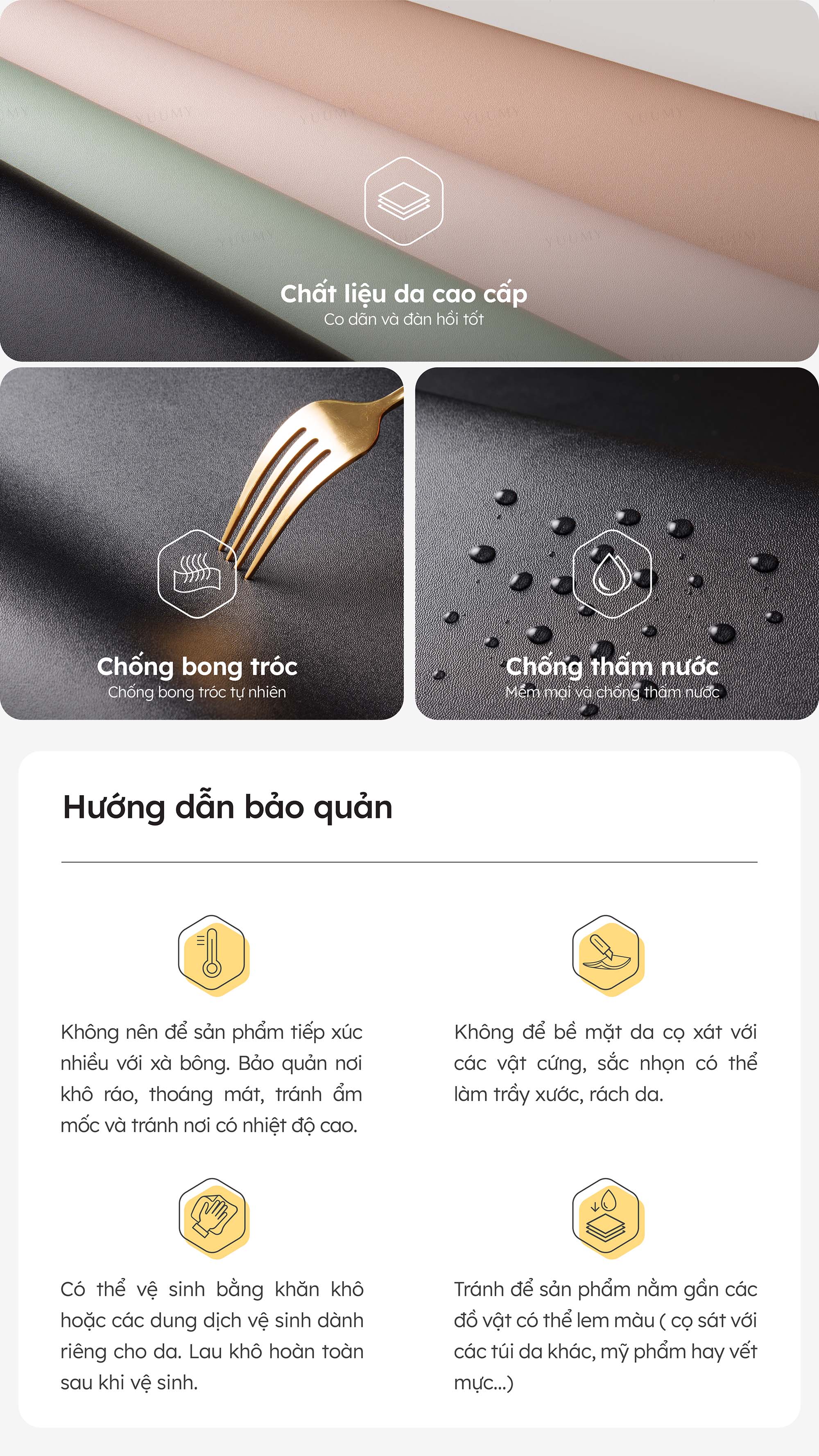 - Có thể vệ sinh bằng khăn khô hoặc các dung dịch vệ sinh dành riêng cho da
