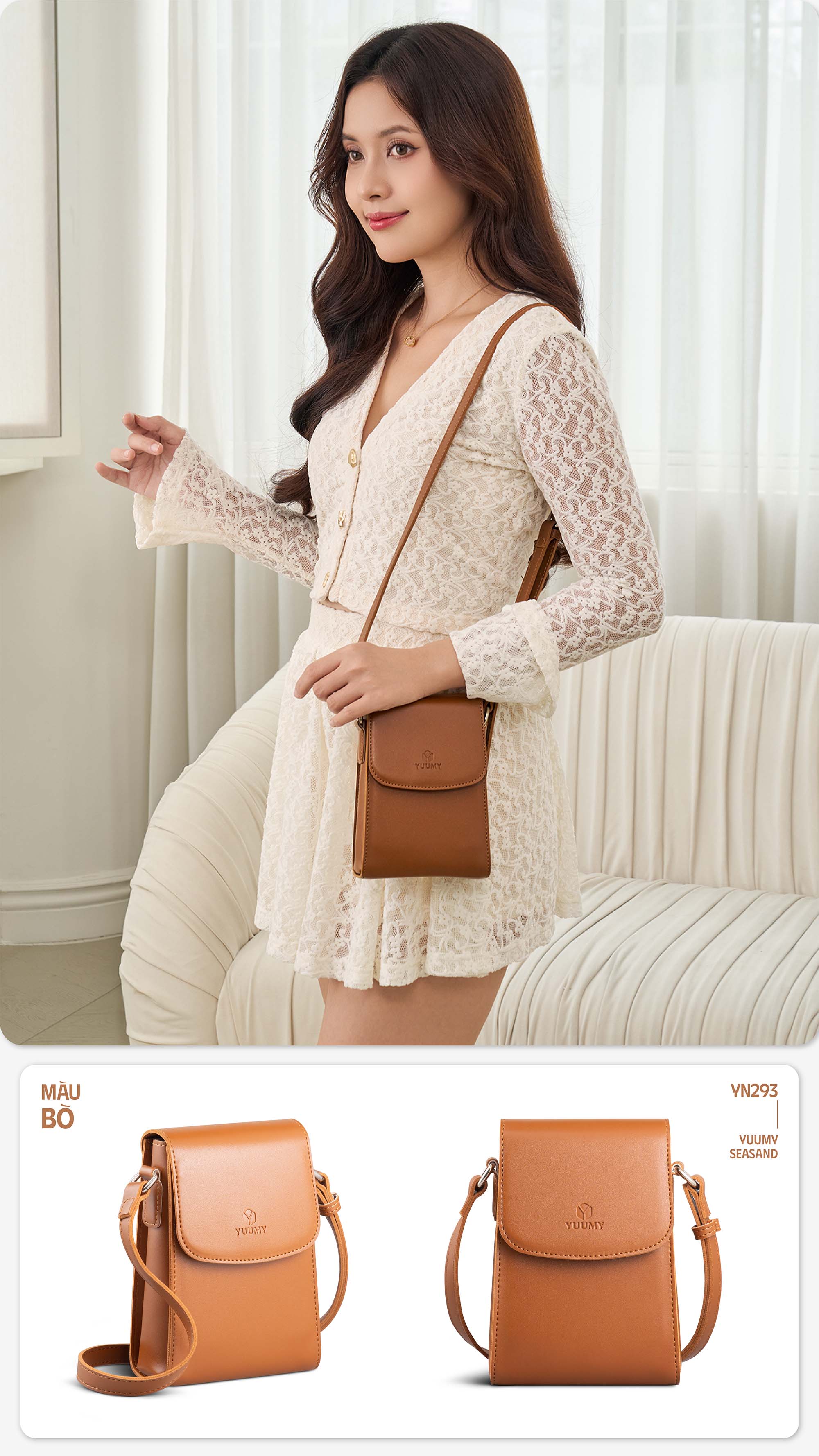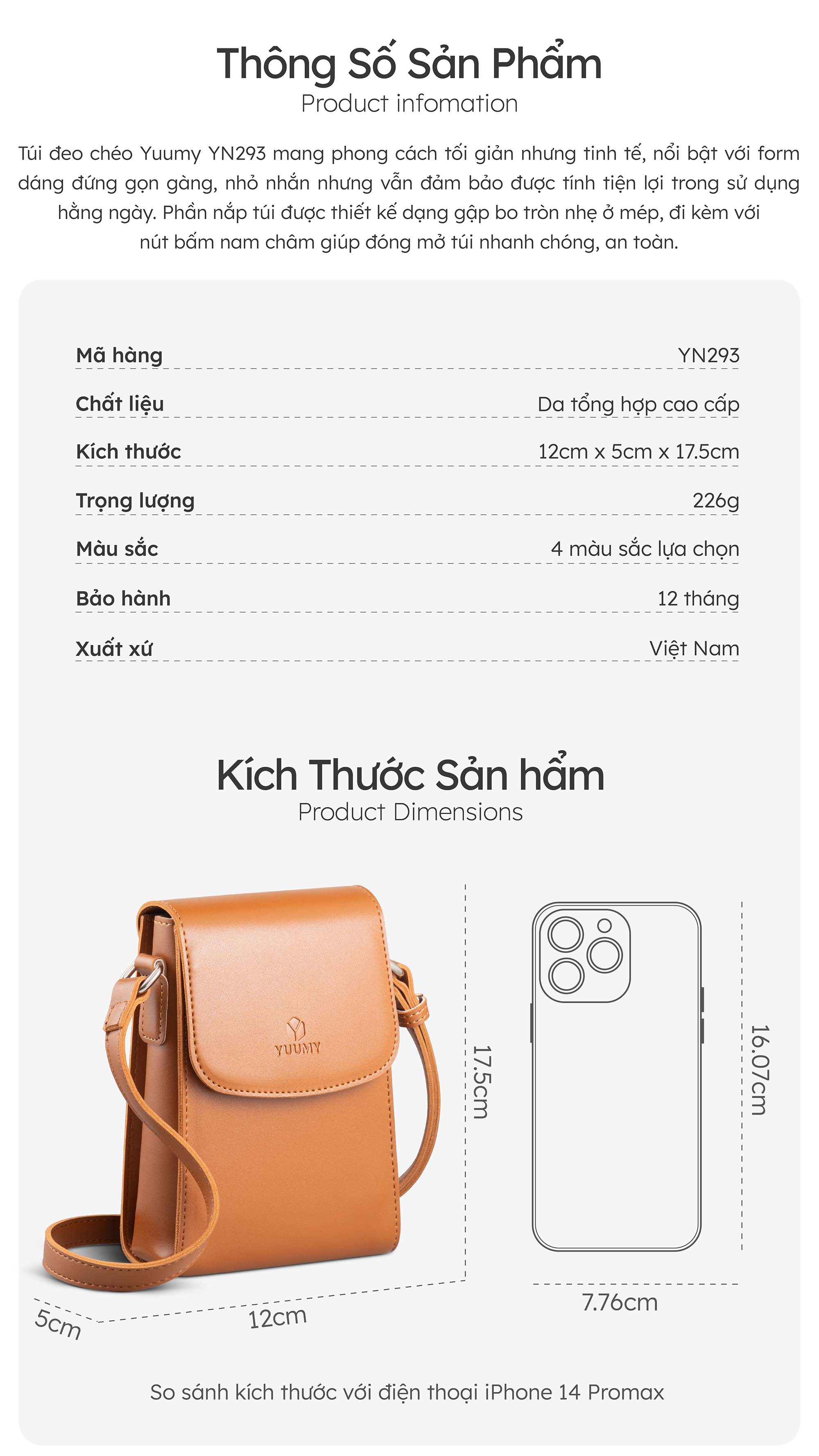 Túi đeo chéo Yuumy YN293 mang phong cách tối giản nhưng tinh tế, nổi bật với form dáng đứng gọn gàng, nhỏ nhắn nhưng vẫn đảm bảo được tính tiện lợi trong sử dụng hằng ngày. Phần nắp túi được thiết kế dạng gập bo tròn nhẹ ở mép, đi kèm với nút bấm nam châm giúp đóng mở túi nhanh chóng, an toàn. Túi được làm từ da tổng hợp cao cấp, bề mặt trơn mịn, có độ bóng nhẹ dễ lau chùi và khả năng chống thấm nhẹ . YN293 không chỉ mang tính thời trang mà còn hướng tới sự tiện dụng và linh hoạt trong nhiều hoàn cảnh sử dụng: đi chơi, đi làm, đi cà phê hay cả khi đi du lịch nhẹ nhàng.