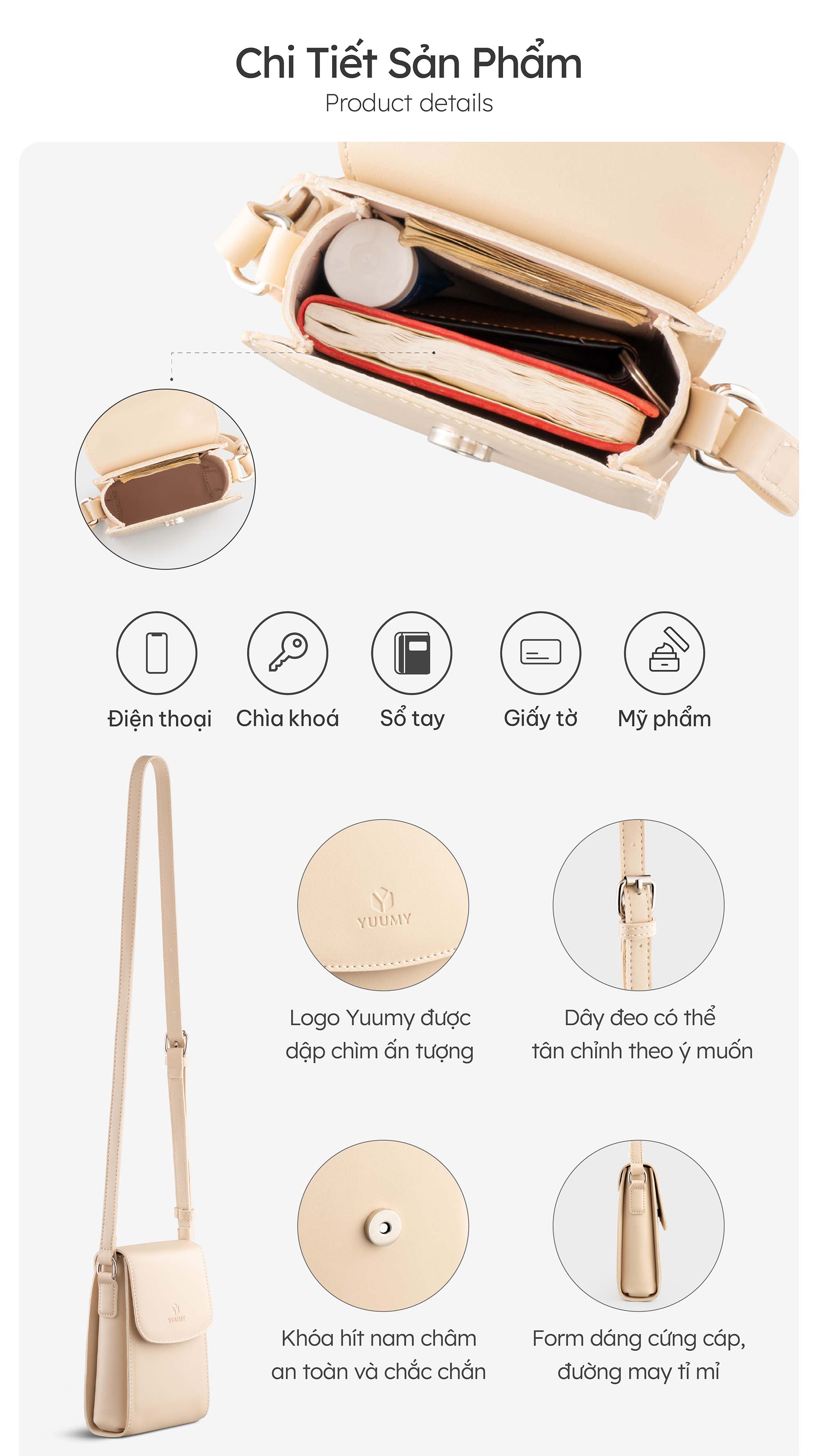- Công dụng: Đựng tiền, điện thoại, son, phấn, chìa khóa, CCCD …
