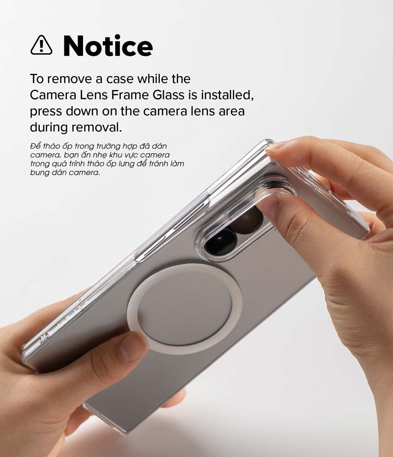 - Để tháo ốp trong trường hợp thiết bi đã dán bảo vệ camera, bạn ấn nhẹ vào vị trí camera để tránh bị bong lớp dán camera trong quá trình tháo ốp lưng.