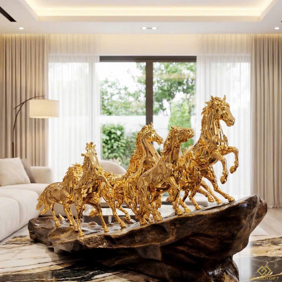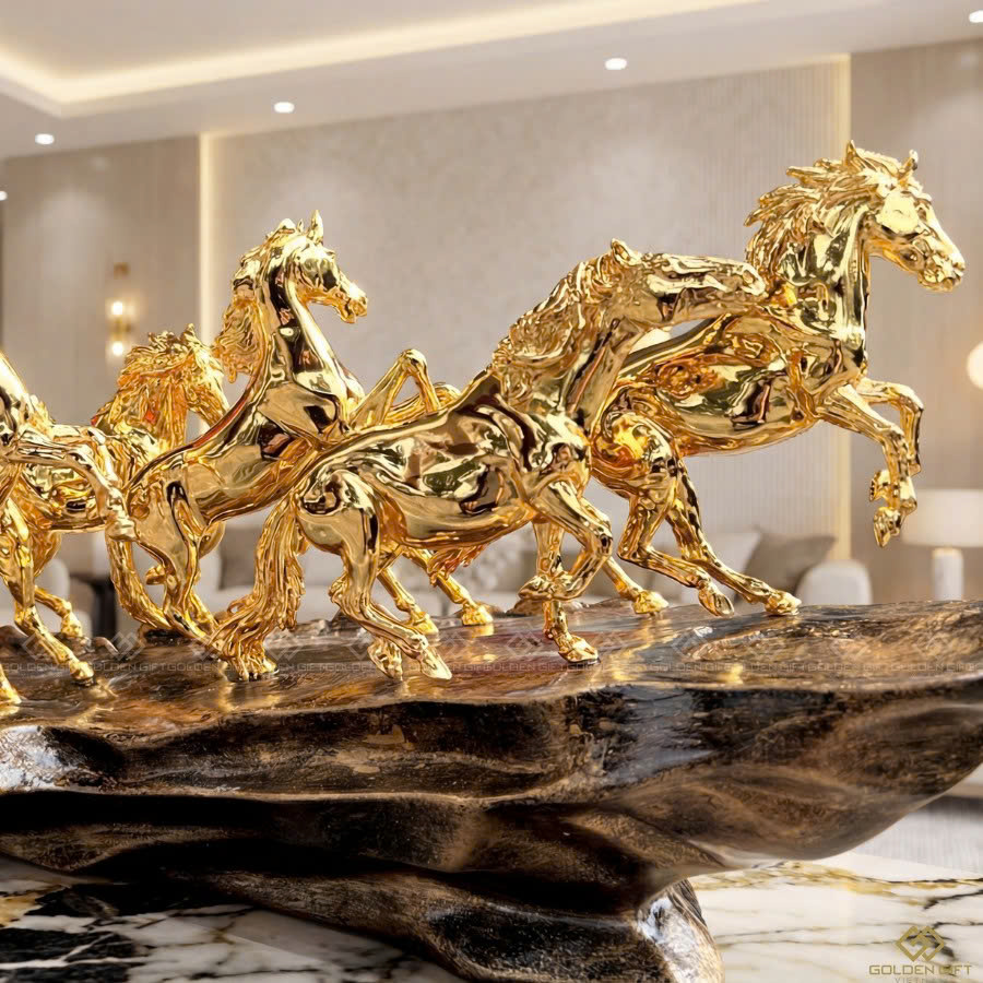 Với hình ảnh 8 chú ngựa phi nước đại như mang theo nguồn năng lượng của sự tốc độ, sức mạnh, sự bản lĩnh và sự đoàn kết, những yếu tố luôn gắn liền với người lãnh đạo. Khi được phủ lên mình lớp vàng 24K quyền lực, tác phẩm không chỉ trở thành điểm nhấn sang trọng cho không gian làm việc hay phòng khách, mà còn là lời chúc về sự hanh thông, tài lộc, sự nghiệp thăng tiến “mã đáo thành công”. Chính vì vậy, bộ tượng Bát Mã Truy Phong mạ vàng là quà tặng độc đáo, ấn tượng trong những dịp lễ Tết, tân gia, sinh nhật hay mừng lên chức.