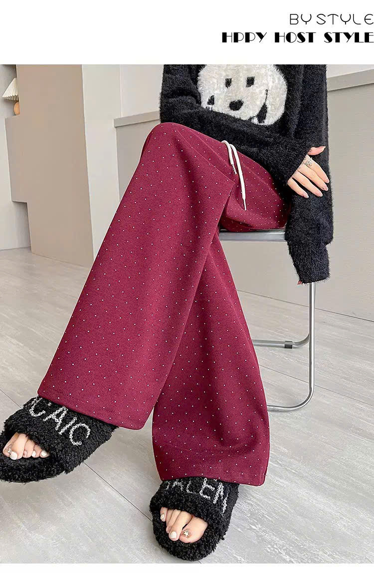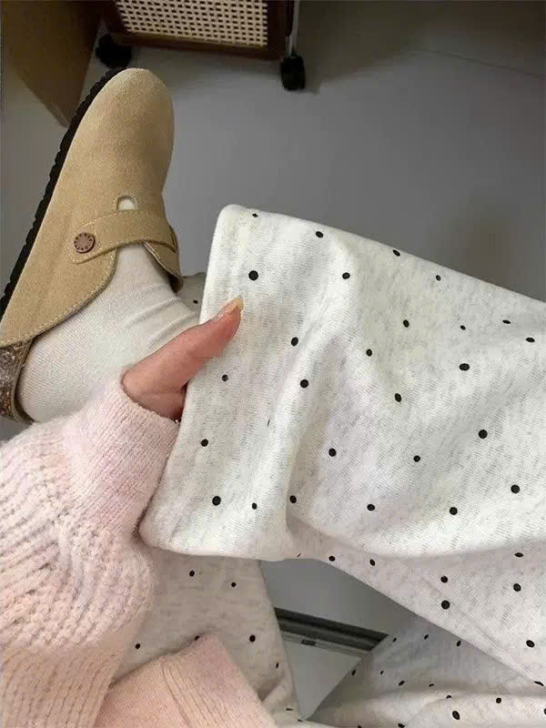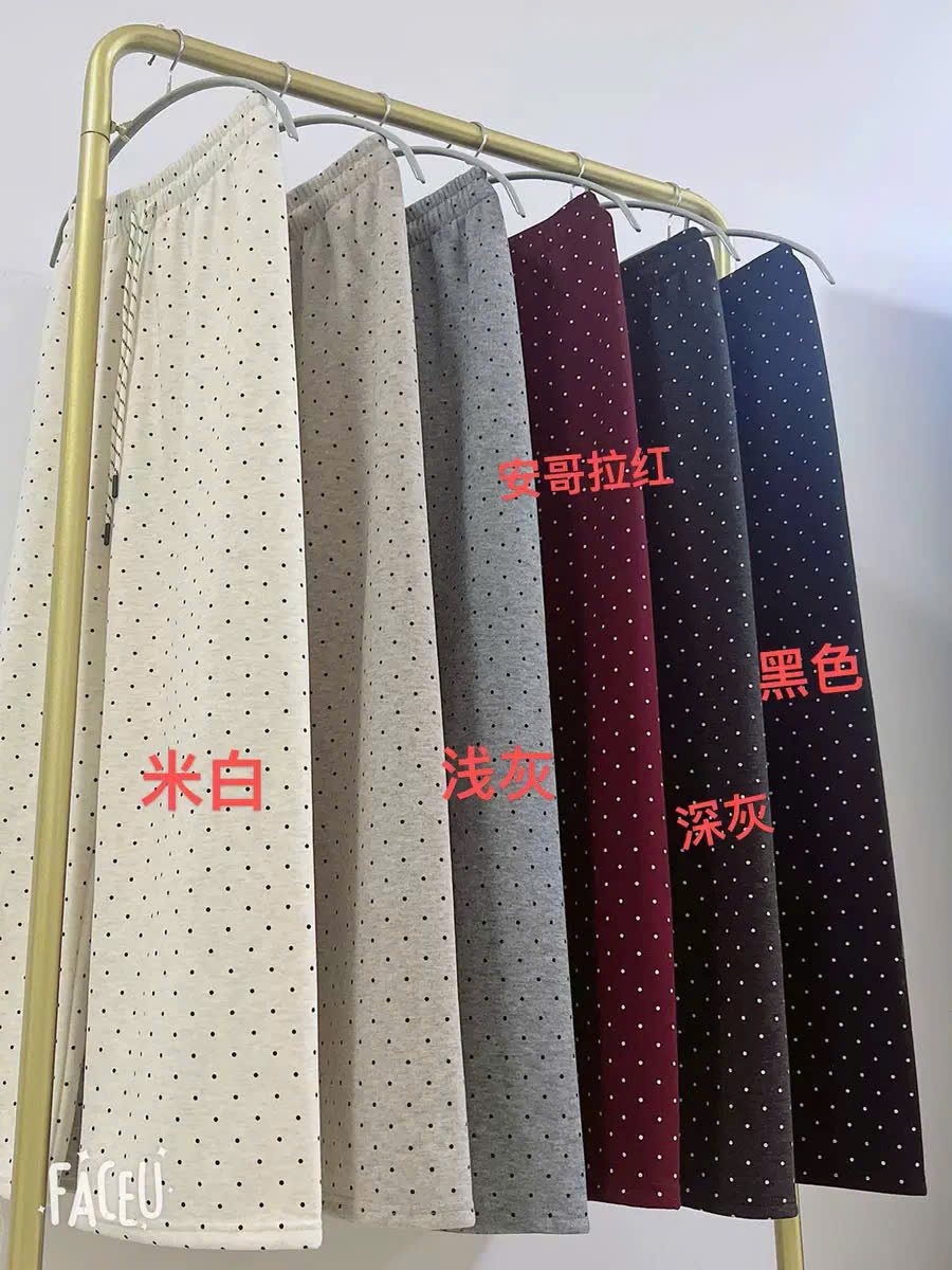 2. Chất liệu: Vải thun cotton , lót lông cừu. Thiết kế quần suông ống rộng ống đứng , hoạ tiết chấm bi có lót lông cừu, dày dặn, lưng cao, phong cách Hàn Quốc
