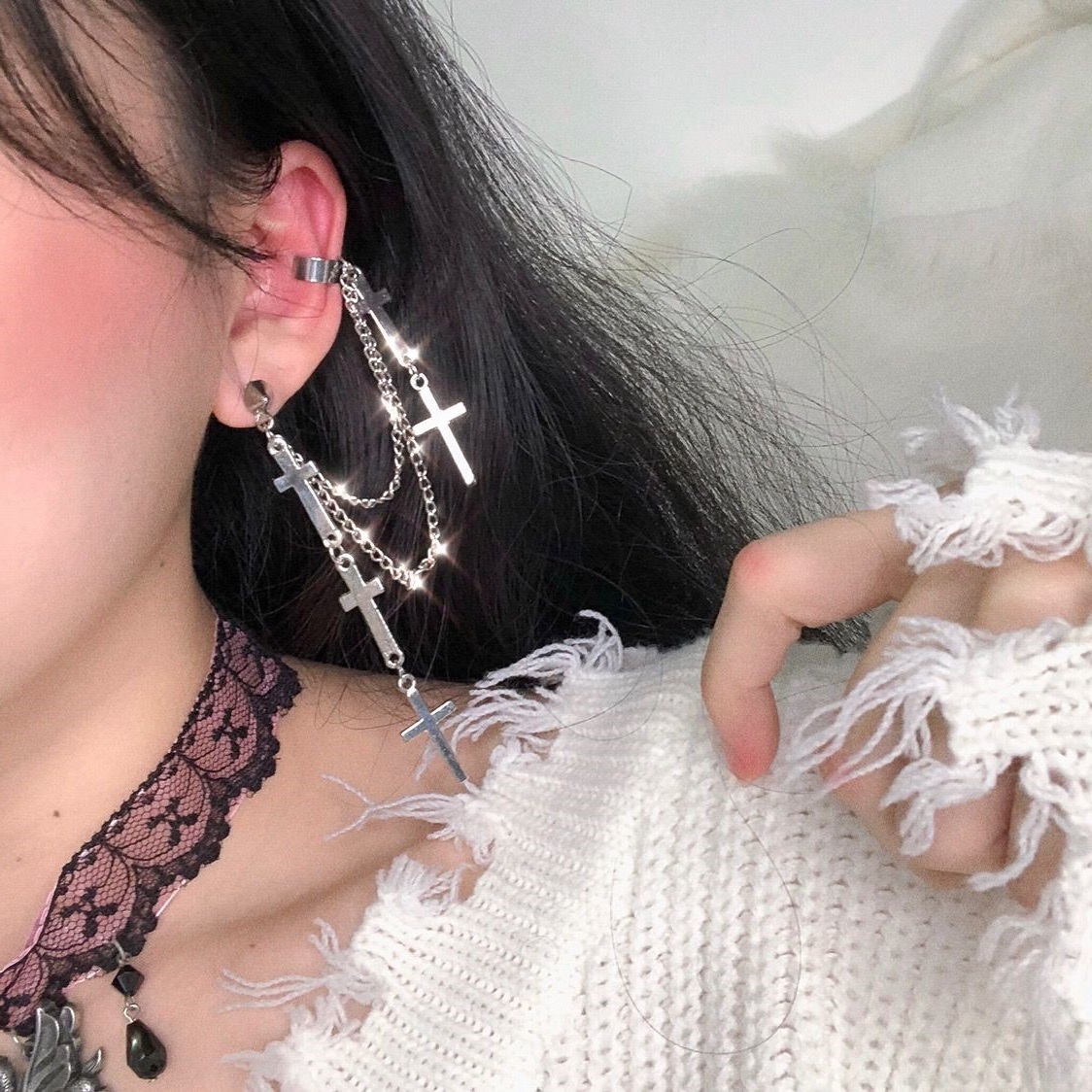 Bông tai được gia công thủ công từ Titan nguyên chất, sáng bóng, không han, không gỉ, an toàn cho da. Sản phẩm được thiết kế một đầu xỏ lỗ một đầu kẹp vành. Hai chuỗi chữ thập thả xuông bất đối xứng được nối với nhau bằng hai chuỗi xích titan thả vòng cung cực cá tính. Ý tưởng thiết kế độc lạ, mạnh mẽ phù hợp với các bạn trẻ ưa chuộng style táo bạo, phá các. Dành cho mọi giới tính. Phù hợp với trang phục trẻ trung, năng động. Bền hơn khi ít tiếp xúc với hóa chất. Sản phẩm bán một chiếc.
