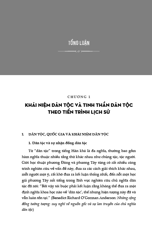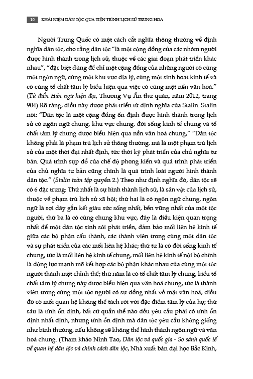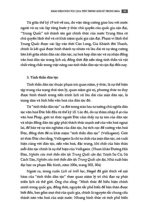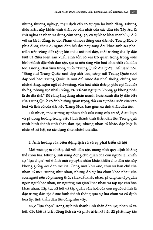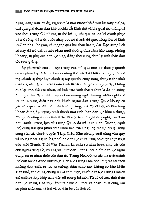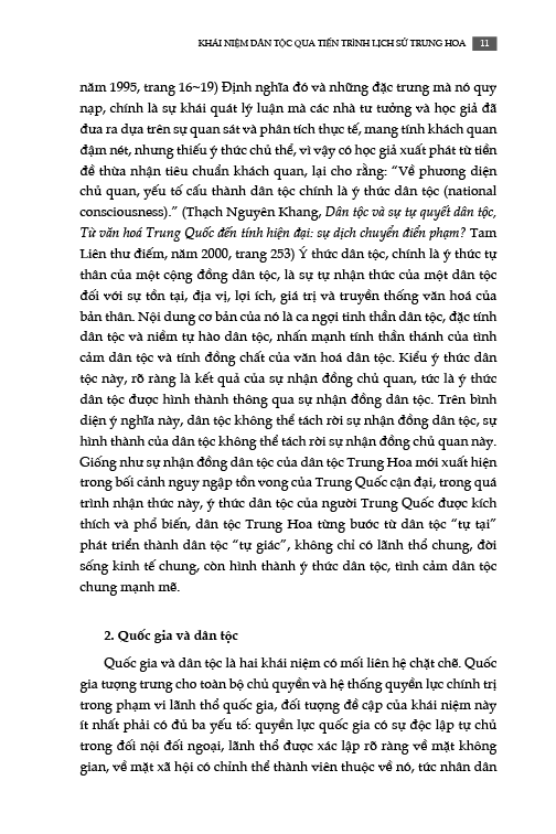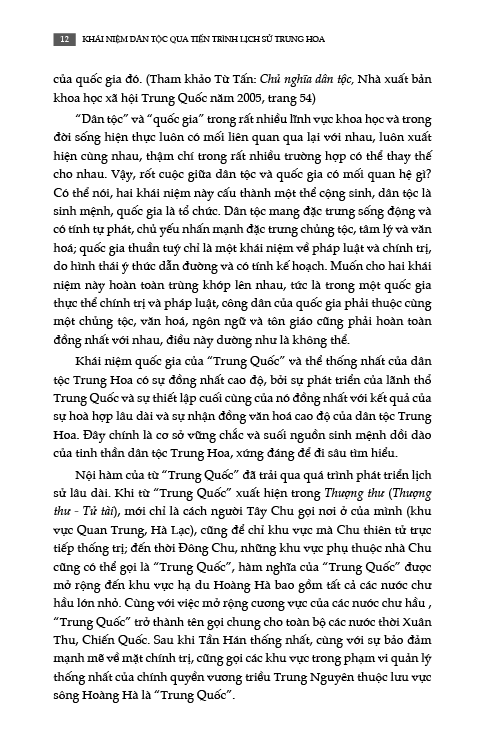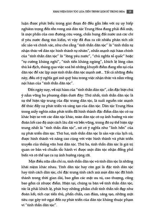 Cuốn sách Khái niệm dân tộc qua tiến trình lịch sử Trung Hoa trình bày và nghiên cứu một cách hệ thống và toàn diện về quan niệm dân tộc trong dòng chảy lịch sử Trung Quốc. Xuất phát từ góc nhìn lịch sử, cuốn sách đã bao quát về tiến trình phát triển và đặc trưng của quan niệm dân tộc từ thời Tiên Tần cho đến thời cận đại. Với những dao động giữa khai phóng và bảo thủ, giữa cởi mở và hẹp hòi, giữa bao dung hài hoà và bài xích cực đoan, cuốn sách đã chỉ ra mối liên hệ khăng khít giữa tinh thần dân tộc và tình hình văn hoá, chính trị, xã hội của các giai đoạn lịch sử.
